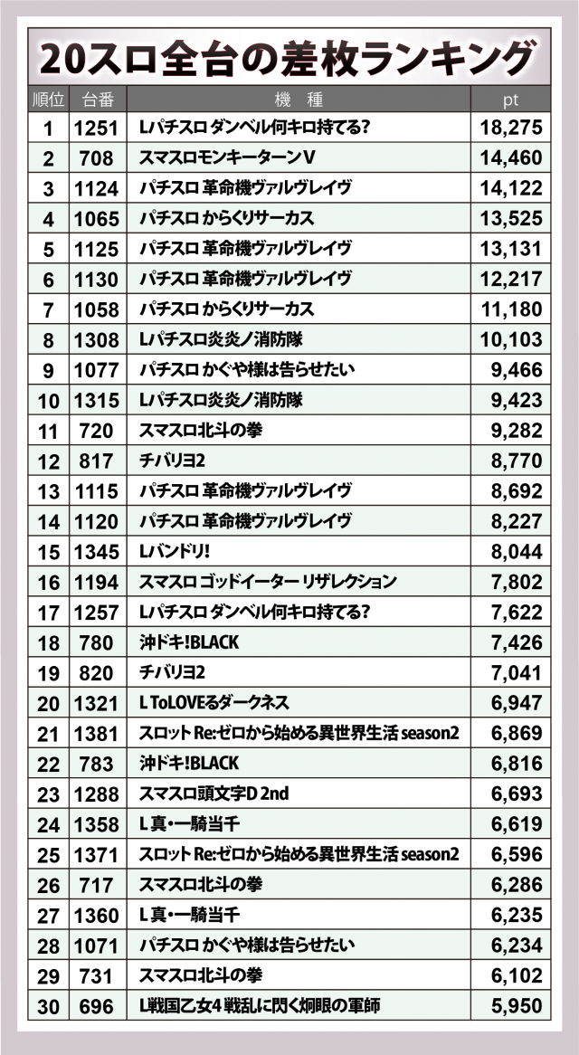 139台と20スロ最多設置の『ドラゴンハナハナ~閃光~ 30』は毎回欠かさずピックアップを行っている。この日の30台ランキングはどうだったのだろうか。