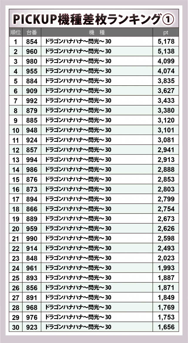 20スロでは毎回『ドラゴンハナハナ~閃光~ 30』139台の定点観測を実施している。同じく上位30台にスポットを当てよう。