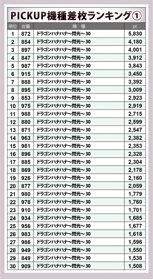 同店のみならず全国でもナンバーワンの設置数139台となる『ドラゴンハナハナ~閃光~ 30』では定点観測が行われている。定例だが優秀30台をピックアップした。