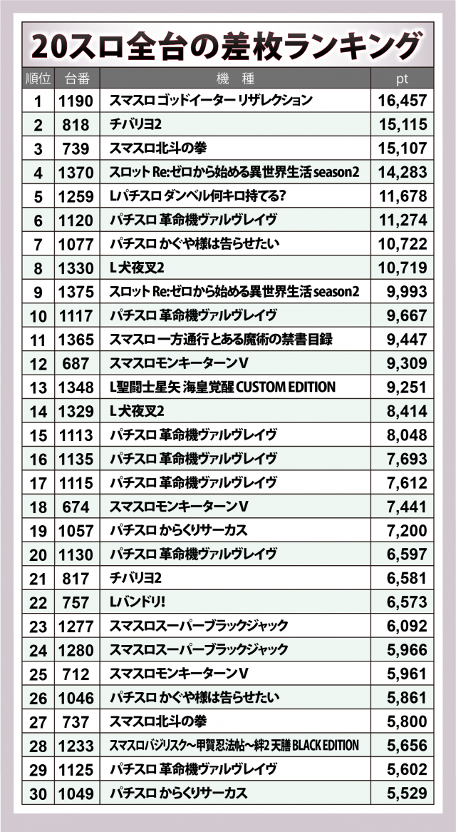 定例だが最初に目を配るのは20スロのベスト30台だ。