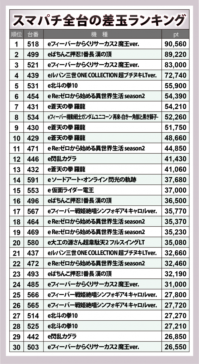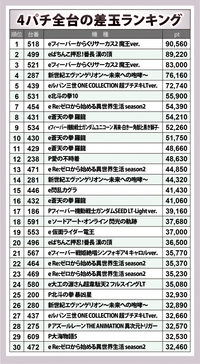 スマパチの頂点に輝いたのが+9万1千弱の『eフィーバーからくりサーカス2 魔王ver.』518番台。シマ内では+8万3千超・+3万1千超・+2万7千弱が1台ずつあり、4パチのMVPであることが窺えた。
