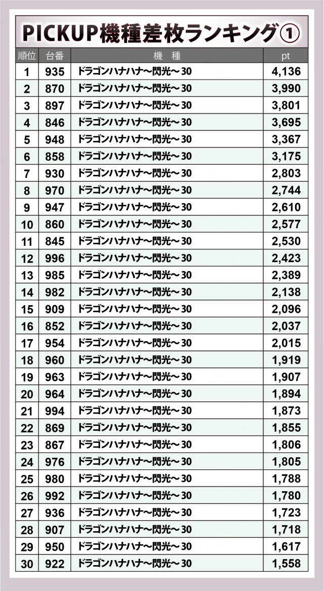 同店で最多かつ全国でもナンバーワンの設置である『ドラゴンハナハナ~閃光~ 30』139台は欠かさず定点観測を行っている機種。今回もトップ30台をクローズアップしよう。