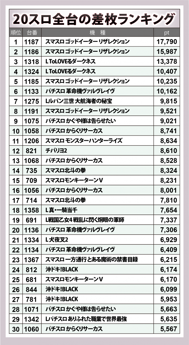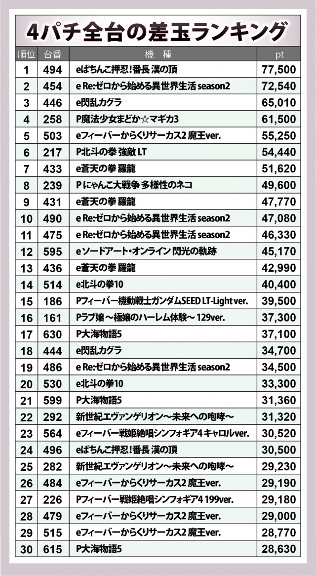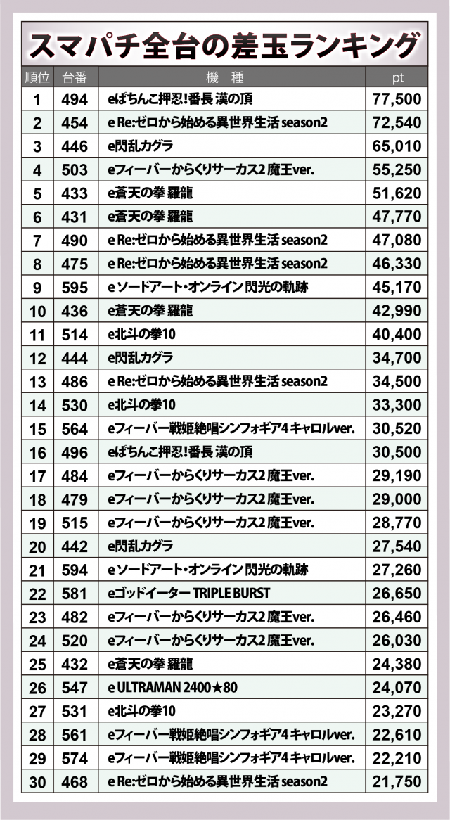 『eぱちんこ押忍!番長 漢の頂』の+7万8千弱を筆頭に、『e Re:ゼロから始める異世界生活 season2』では+7万3千弱・+4万7千超・+4万6千超・+3万5千弱が1台ずつ、『e閃乱カグラ』では+6万5千超・+3万5千弱が1台ずつ、『eフィーバーからくりサーカス2 魔王ver.』では+5万5千超が1台・+2万5千超が5台、『e蒼天の拳 羅龍』の+5万2千弱×1&+4万超×2と、素晴らしい成績が相次いだ。