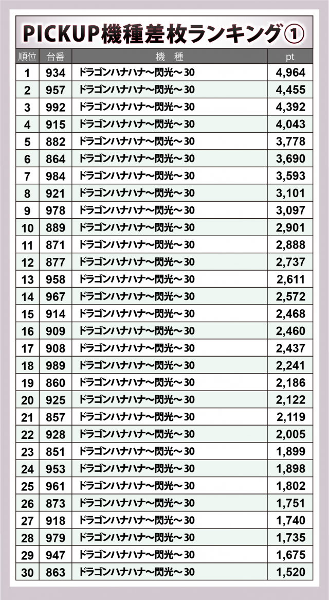 139台と圧倒的な設置台数を誇る『ドラゴンハナハナ~閃光~ 30』は同店の看板マシンの1つ。定例ながらベスト30台に迫る。