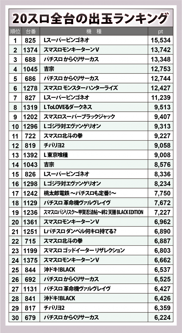 5万を超える出玉となったのは8台、このランキングの30台ではオール3万2千以上と、大量獲得が続出。