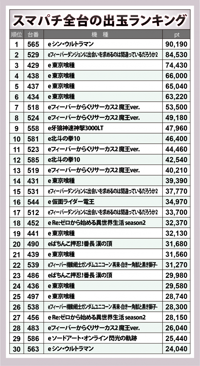 好調台の数が目立ったのが『e 東京喰種』。9台がランクインし、7万4千超を皮切りに6万超が3台と、ビッグヒットが立て続いた。