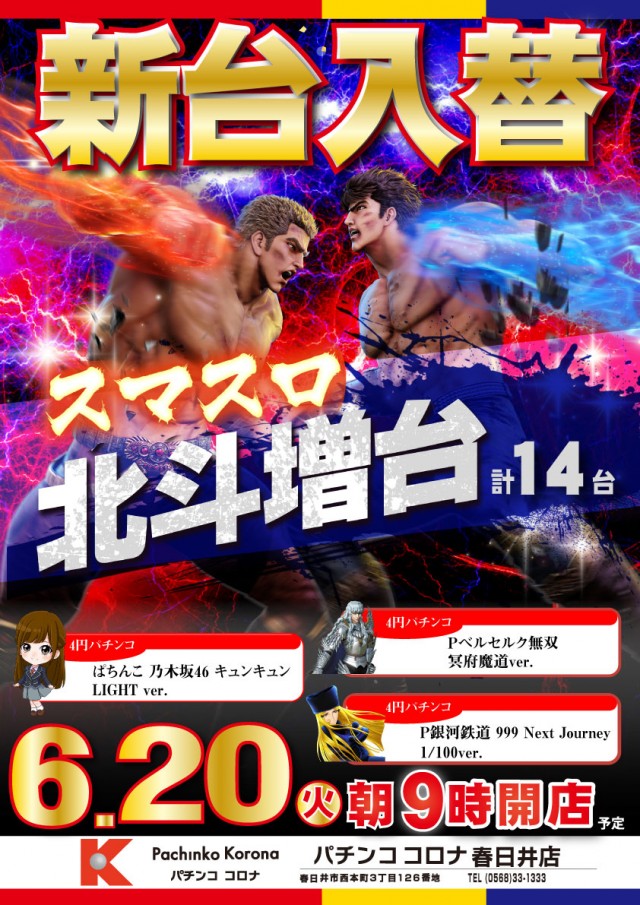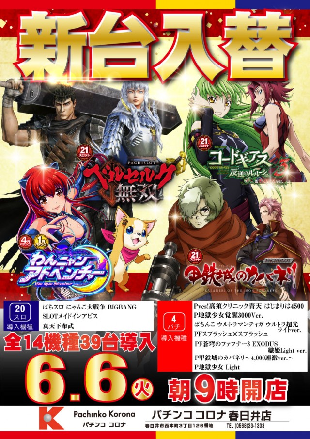 本日6月25日【日】パチンココロナ愛知全店一斉朝9時開店!