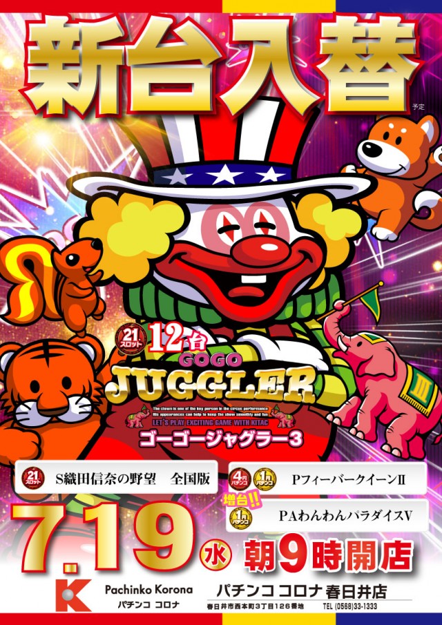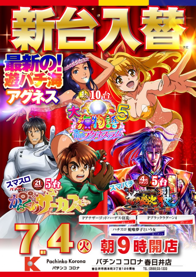 本日7月5日【水】パチンココロナ愛知全店一斉朝9時開店!