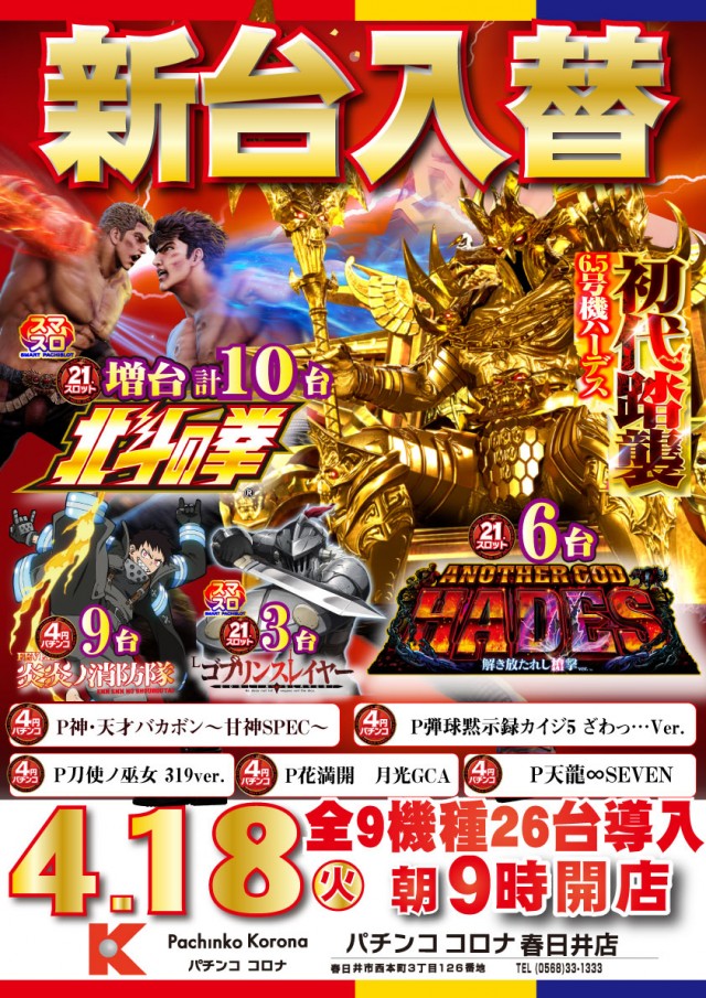 本日4月15日【土】パチンココロナ愛知全店一斉朝9時開店!