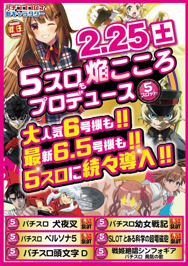 本日2月25日【土】5円スロット6.5号機・人気機種大幅導入