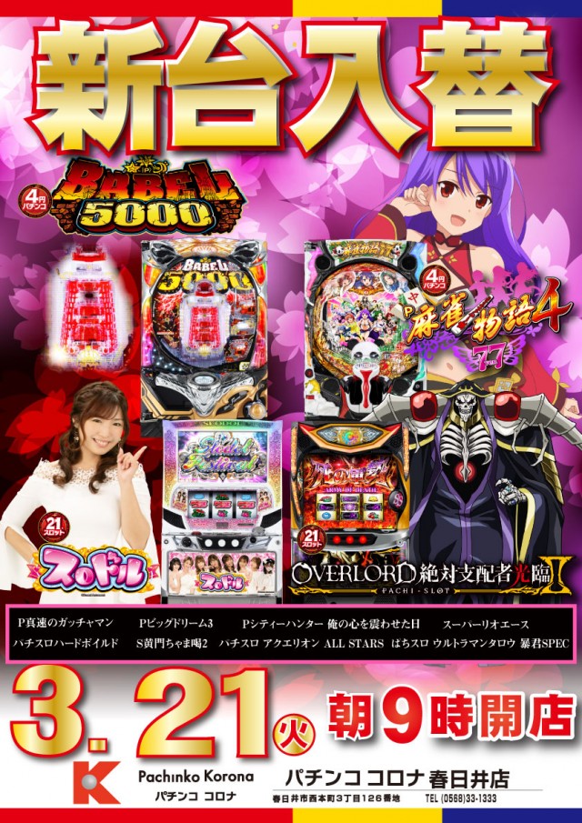 本日3月15日【火】パチンコKORONA 愛知全店一斉開店!
