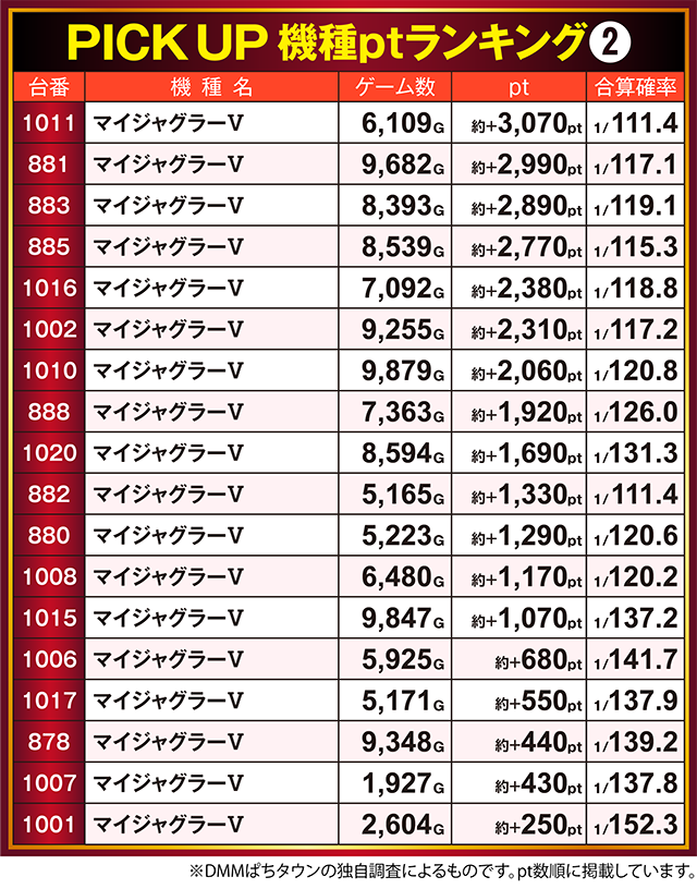 7台が約+2,000ptを超え、1011番台は約+3,000pt以上となりました☆