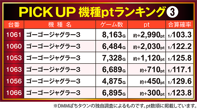 「ゴーゴージャグラー3」も3台が1,100pt以上となり、約+3,000ptを目前とした台もアリ。