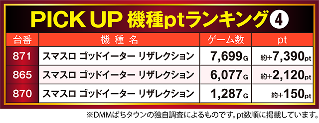 2台が約+2,100ptを超えた「スマスロ ゴッドイーター リザレクション」では、871番台が約+7,390pt!