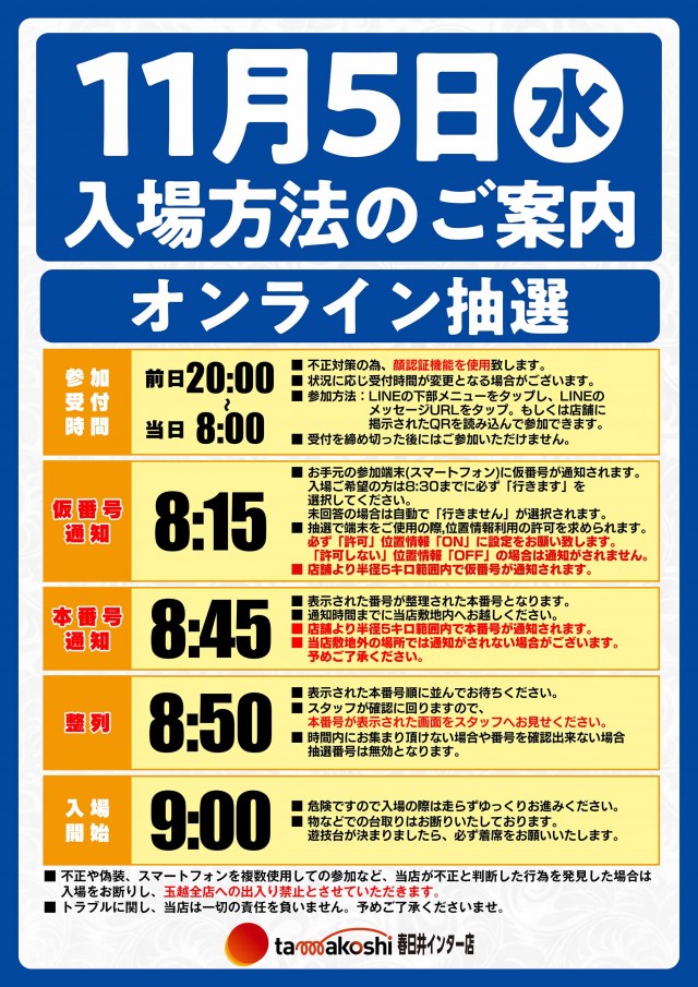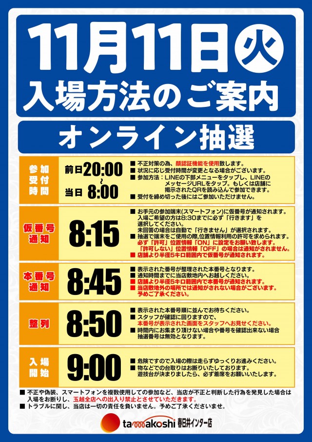 11月5日(水)玉越全店 9時開店 オンライン抽選受付中