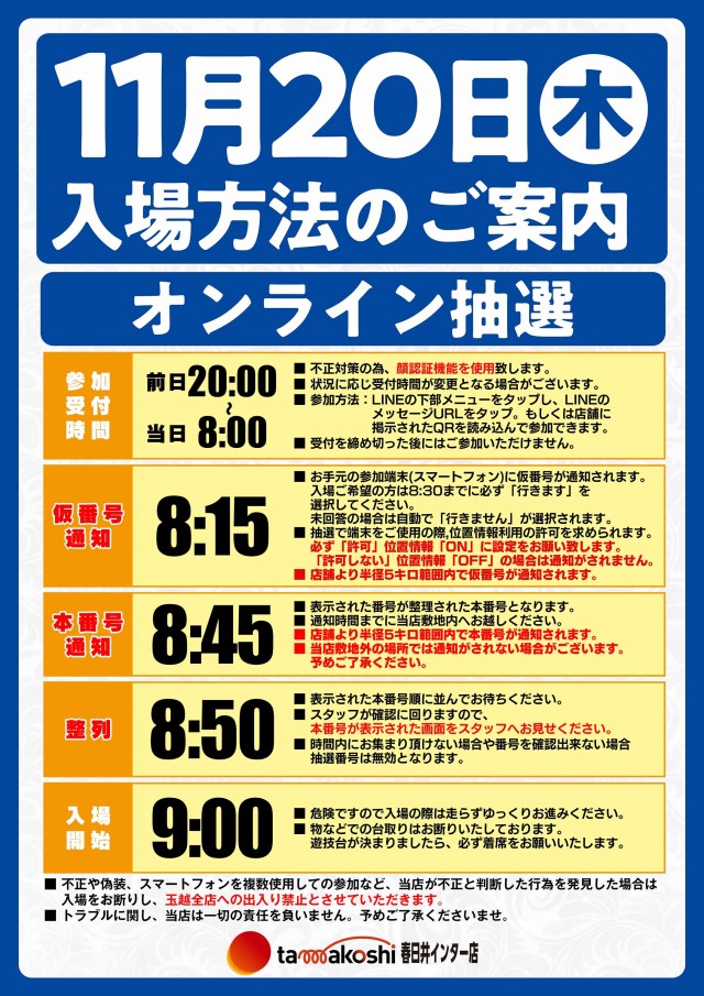 玉越全店朝9時開店オンライン抽選の受付はコチラから♪