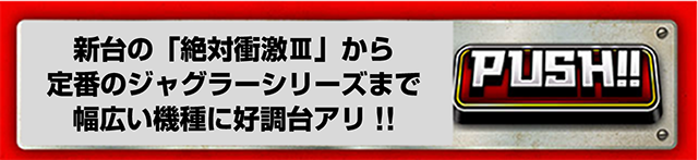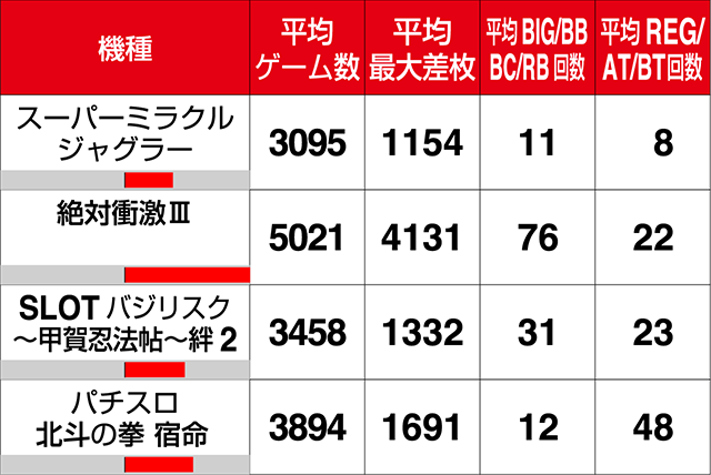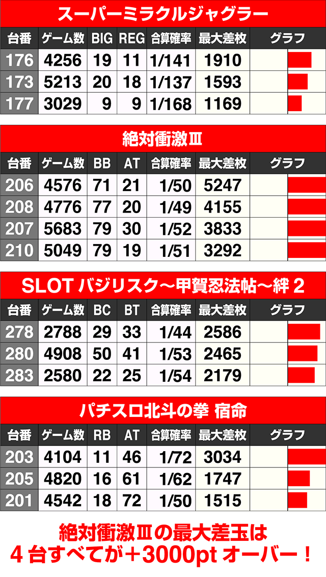 『絶対衝激Ⅲ』は、最大差枚数+5247ptの206番台を筆頭に、4台すべてが最大差枚数+3000pt超。平均最大差枚数は+4131ptと、機種全体が好調であった。