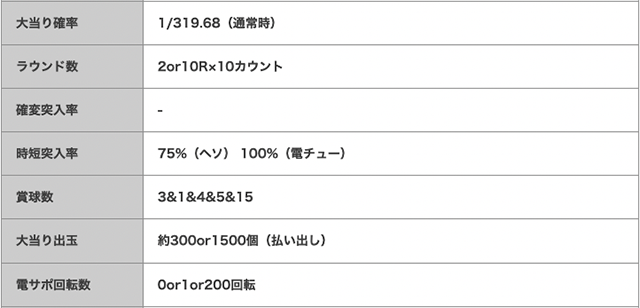 おもに時短1回転+残り保留1個の2回転で連チャンを目指す1種2種混合タイプで、電チュー経由の大当りはすべて出玉約1500個(払い出し)だ。