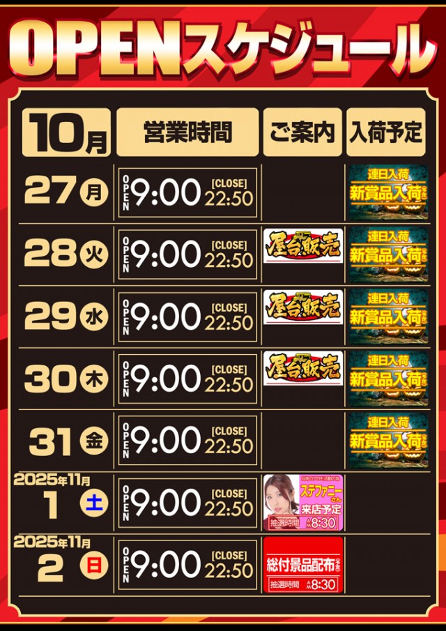 10月27日【月】連日賞品入荷予定!朝9時開店