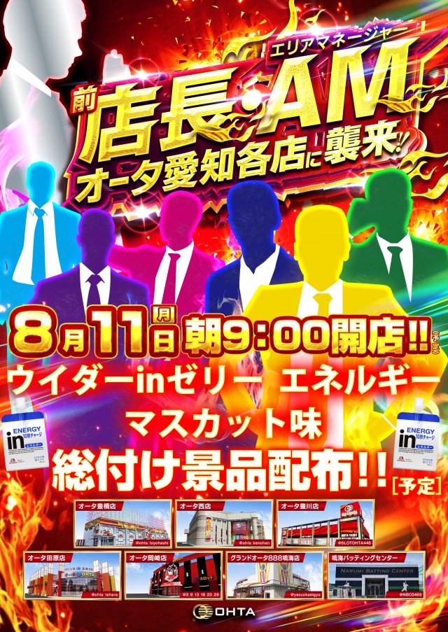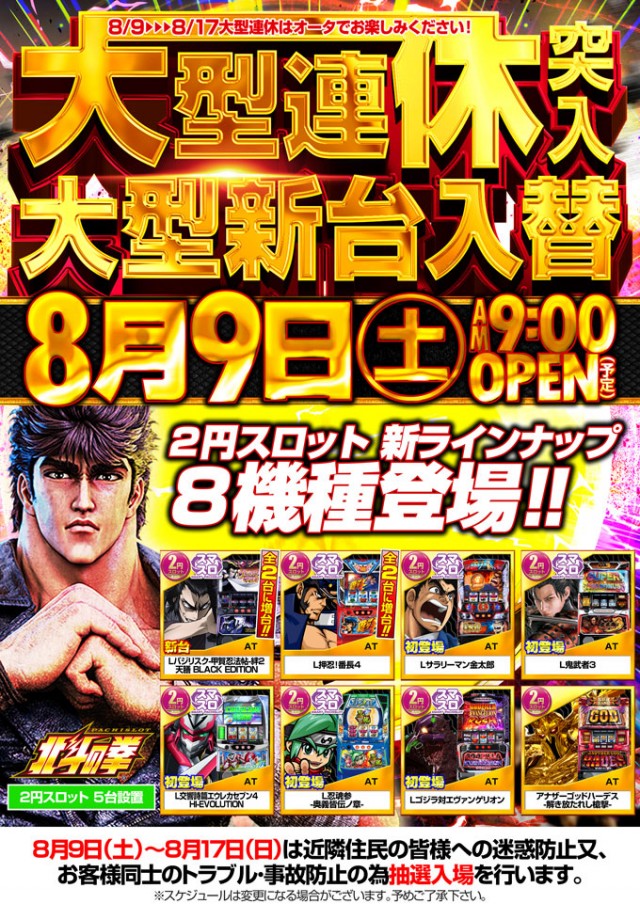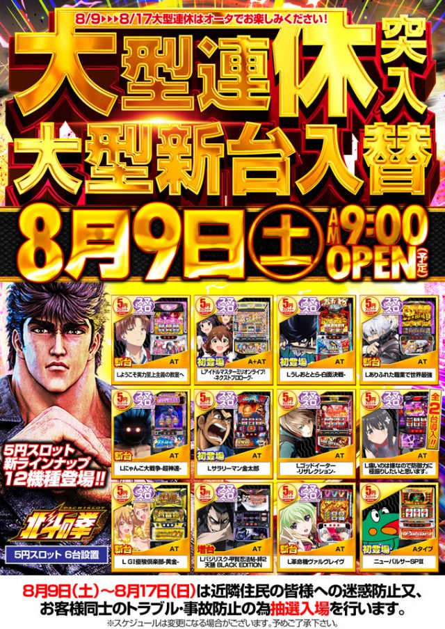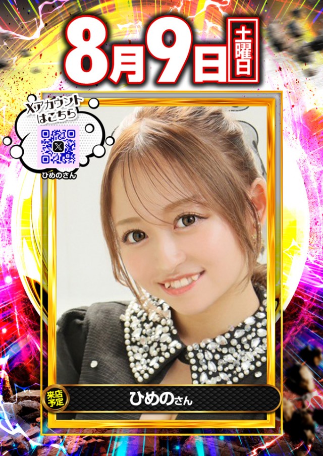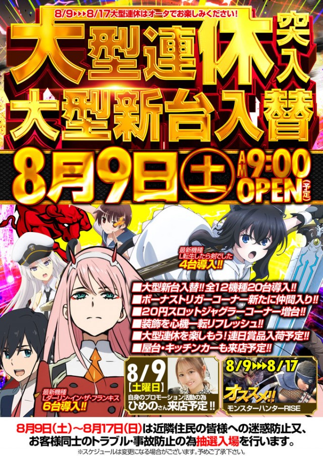 8月9日【土】大型新台入替&ひめのさん来店予定!朝9時開店!