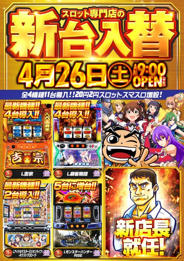 4月26日【土】新台入替!新店長就任!賞品入荷!朝9時開店!