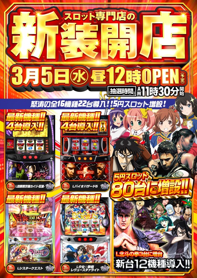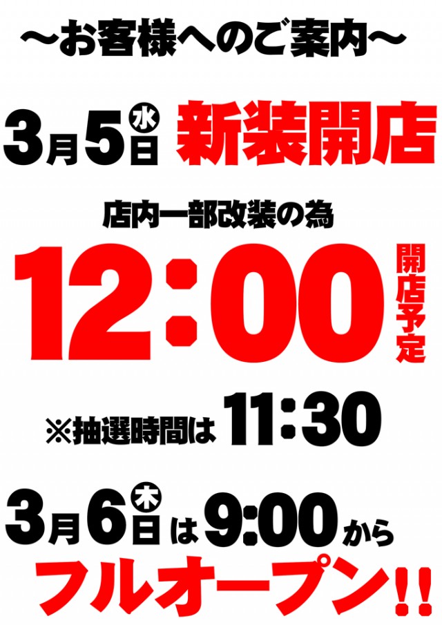 3月5日【水】新装開店!昼12時開店!抽選は11時30分!