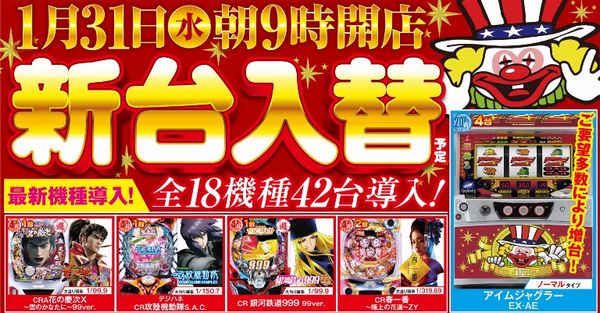 本日1月30日(火)新台入替準備の為、お休みさせて頂きます