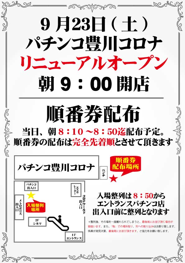 9月24日(日)★パチンコ豊川コロナ★リニューアルオープン&新台入替2日目朝9時開店
