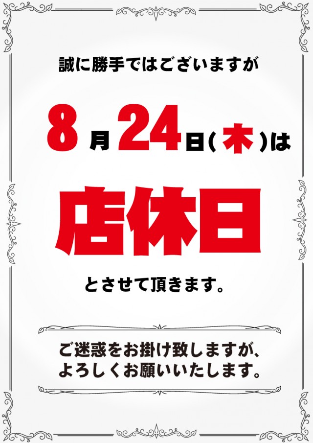 明日8月24日(木)新台入替準備の為、お休みさせて頂きます