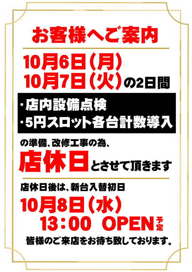 『本日店休日』明日【8日×新台入替】13時オープン★