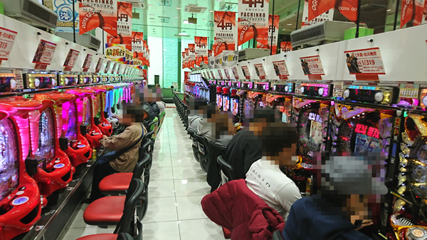 4円パチンコを見てみると、「CRスーパー海物語IN沖縄4」などの海物語シリーズがにぎやかな状況。機種の性能をうまく引き出せているプレイヤーを確認している。