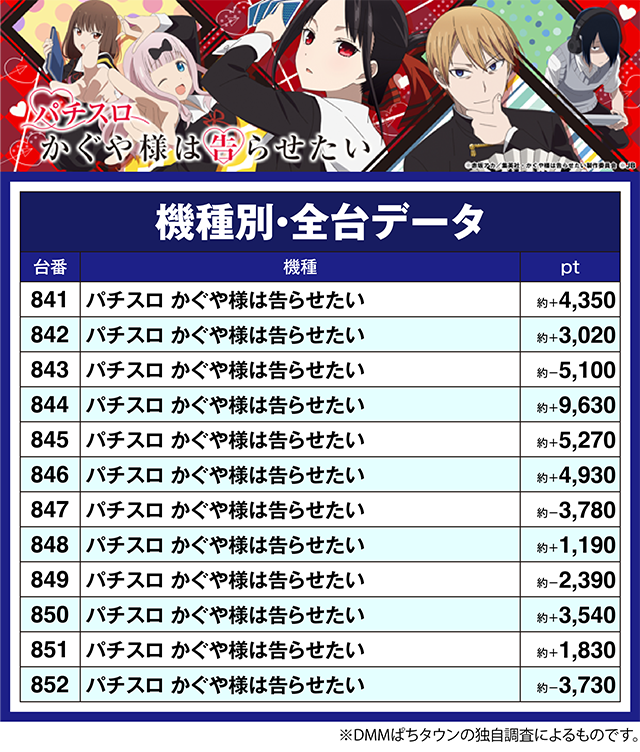 「パチスロ かぐや様は告らせたい」では、844番台が9,636pt。