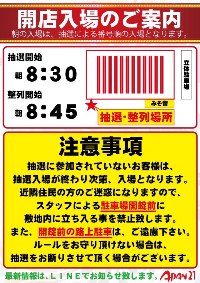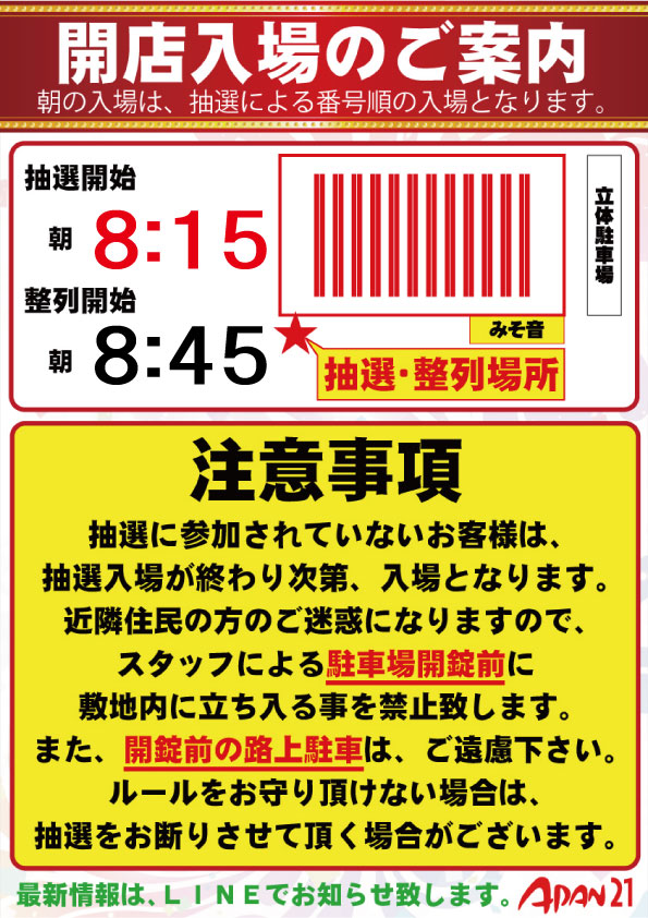 明日21日APAN21全店朝9時OPEN!抽選は8時15分~