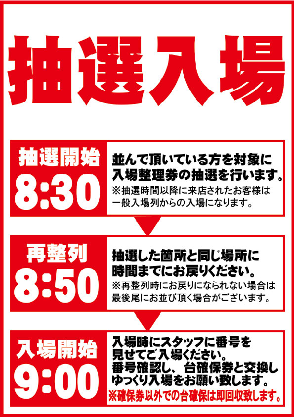 抽選での入場となります。割り込みや物を置いての並びはご遠慮ください。 |