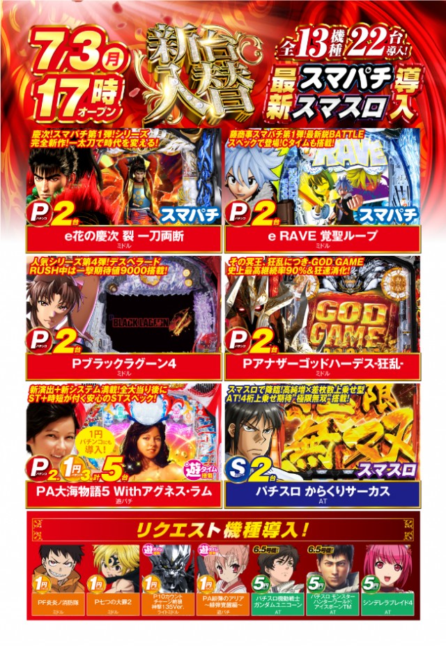7月24日(月)新台入替 17時オープン(予定)