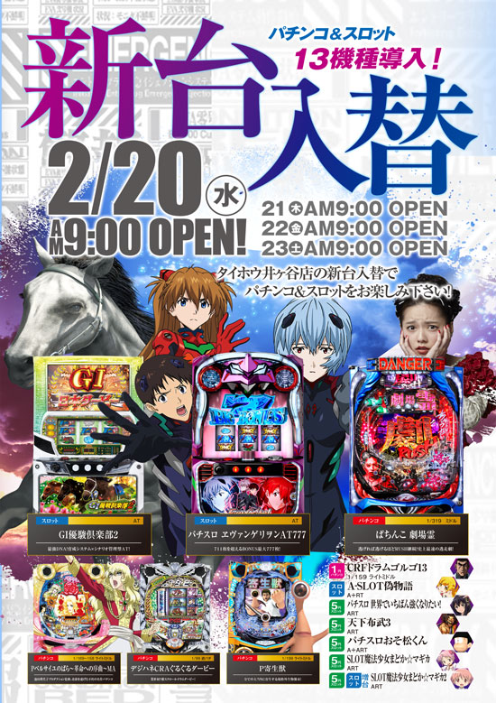 おはようございます。タイホウ井ヶ谷店です。本日2月20日(水)新 台 入 替開 催!
