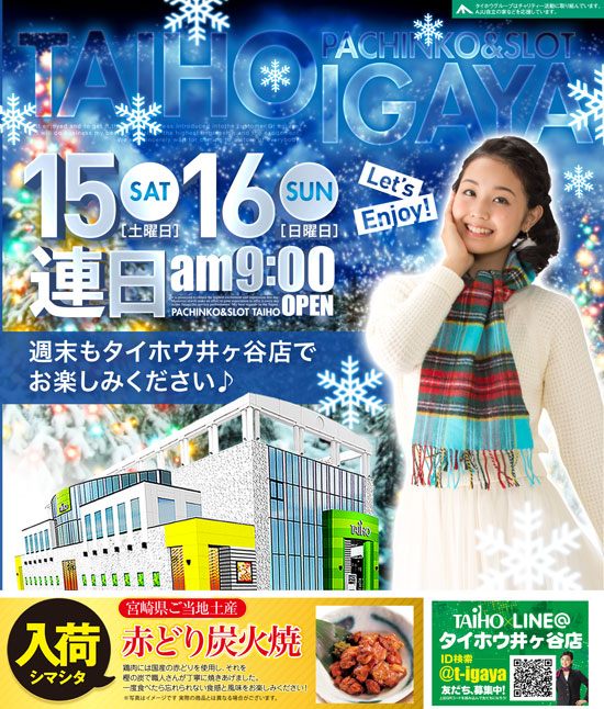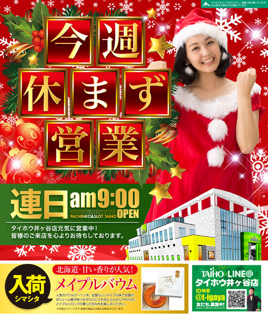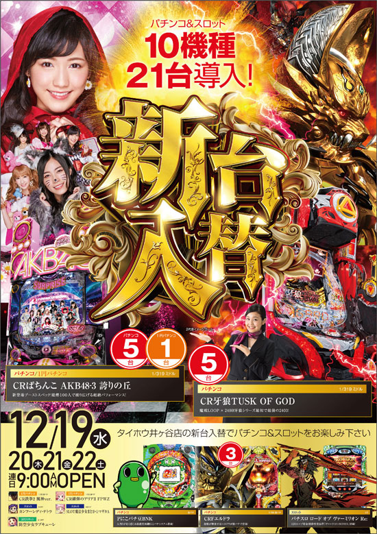 おはようございます。タイホウ井ヶ谷店です。本日12月19日(水)新 台 入 替開 催!