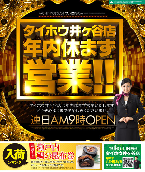 新賞品のご案内!岡山土産瀬戸内 鯛の昆布巻をご用意しております。AM9:00 OPEN!年内休まず営業!皆様のお越しをお待ちしております只今LINE@友達募集中♪新台情報などお店からの最新情報はもちろん設置機種すべてのリアルタイム情報もGETできちゃいます♪友達追加は下記↓をクリック -