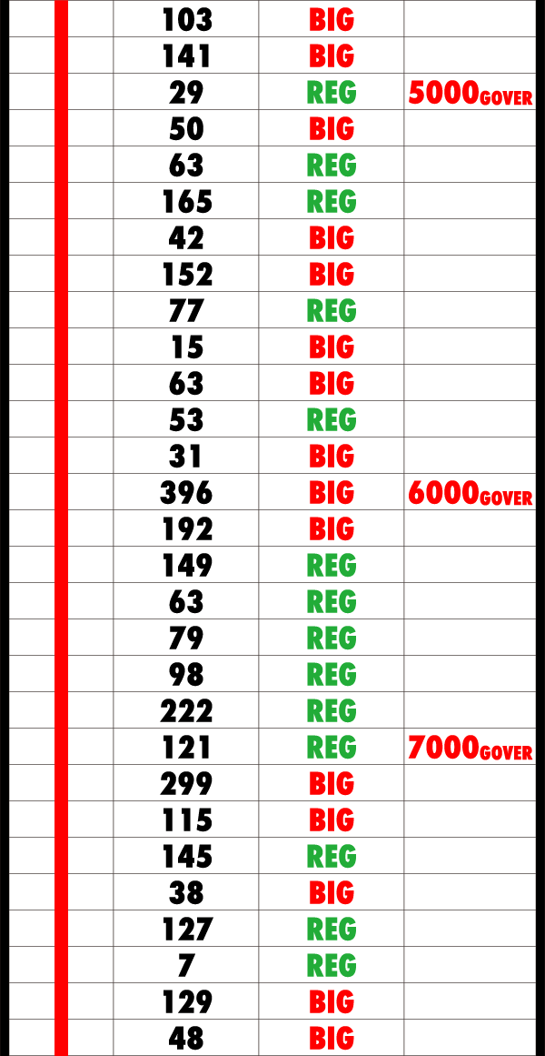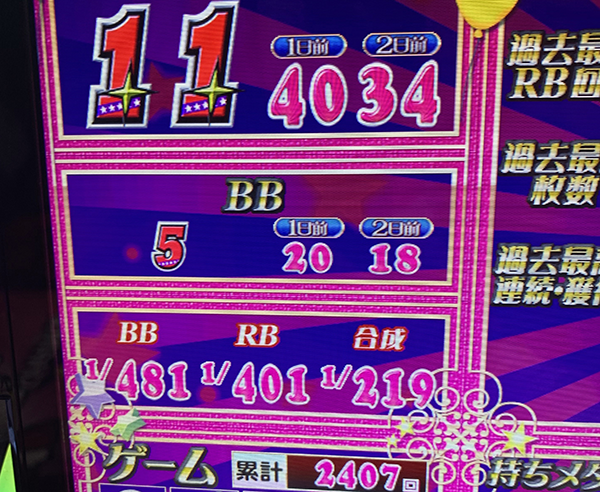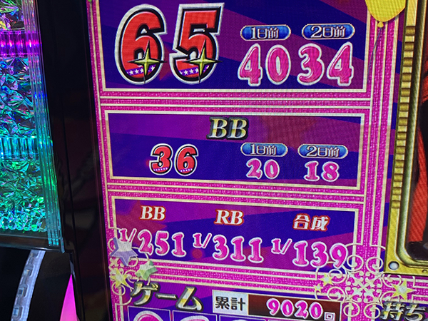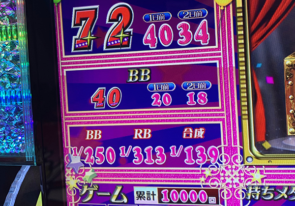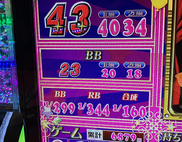 折り返しとなる5000Gを過ぎてからも疲れをみせずにレバーを叩き、18時頃には6800Gを突破。ボーナス合算確率も順調に上がっていき、ダブル達成が期待できる状況となっていた。