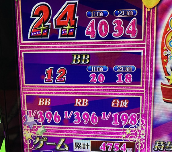 2連覇を達成するべく「ゴーゴージャグラー2」でチャレンジをはじめると、序盤から一気にゲーム数を稼ぐことに成功! 9時オープンということもあり、12時頃には2400Gを通過と理想的なペースでゴールに突き進んでいた。