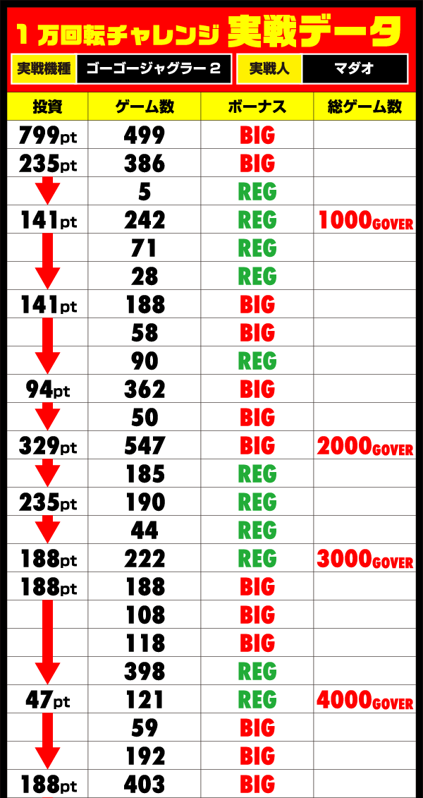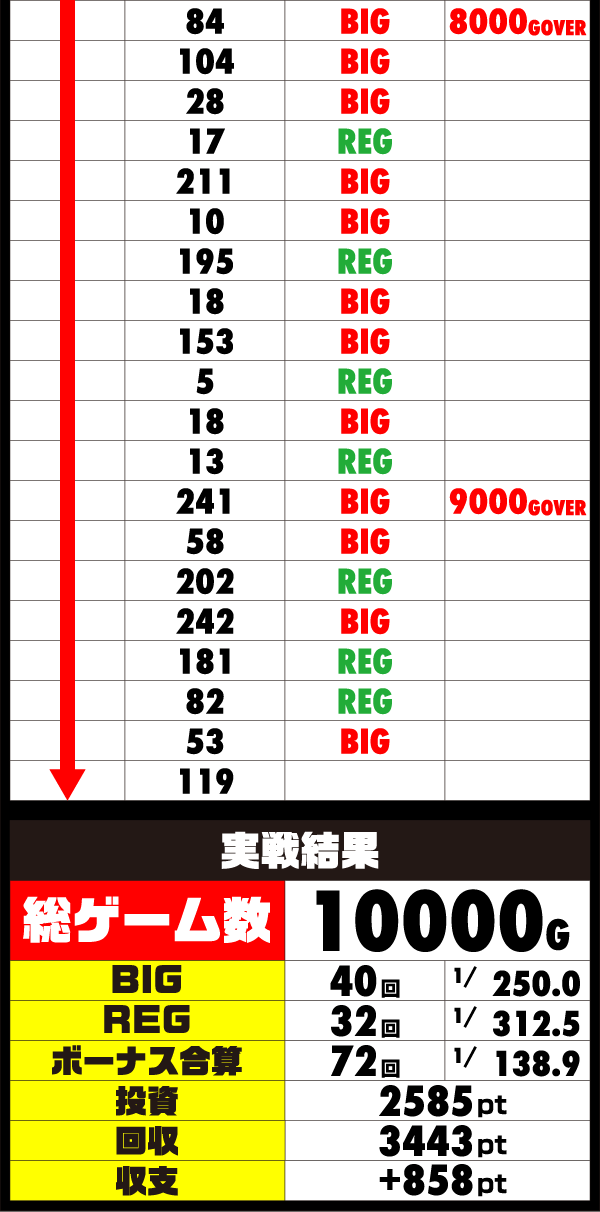 最終的にはゴールまで全力でブン回し、22時を過ぎた頃にきっちりと1万回転に到達!! 70回以上のボーナスを獲得し、ダブル達成という優秀な成績を残すことに成功した。
