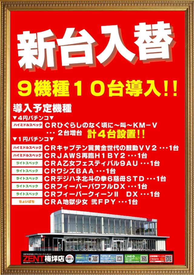 9月19日(水)新台入替初日&チラシ折込日☆朝9時OPEN
