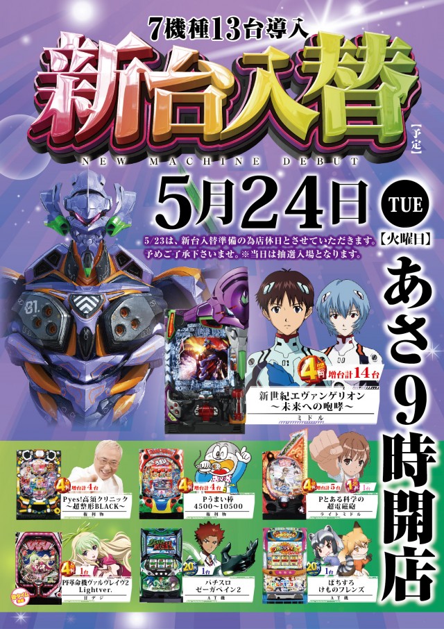 本日5月24日(火)新台入替朝9時開店! 人気機種多数増台!