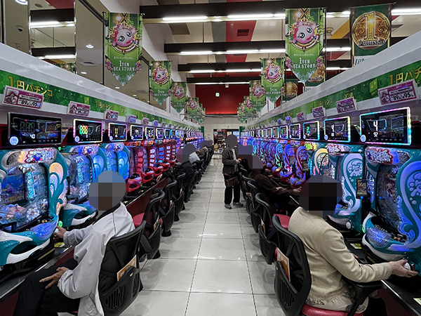15時ごろの1円パチンコでは、「PAスーパー海物語IN地中海2」や「PA海物語3R3」といった海物語シリーズで好調なプレイヤーが多数見受けられ、時折見せる嬉しそうな表情が印象に残っている。