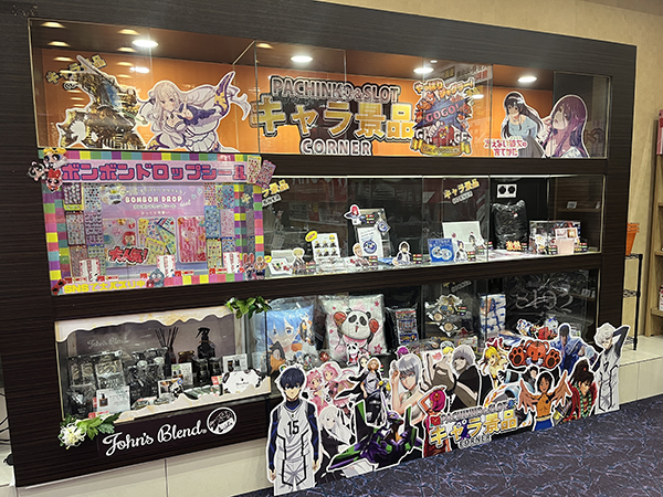 景品コーナーには多彩なキャラクターグッズが用意されており、パチンコ・アニメ好きにはたまらない充実の品揃えとなっている。