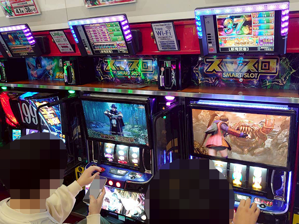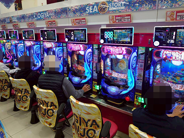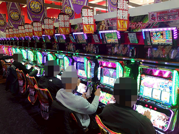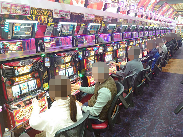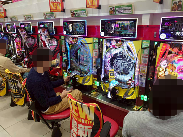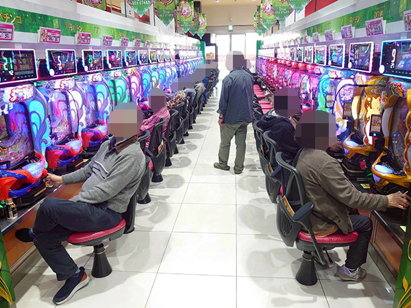 取材時は多くのプレイヤーが来店。パチンコ・パチスロともに、様々な機種が支持を得ていた。