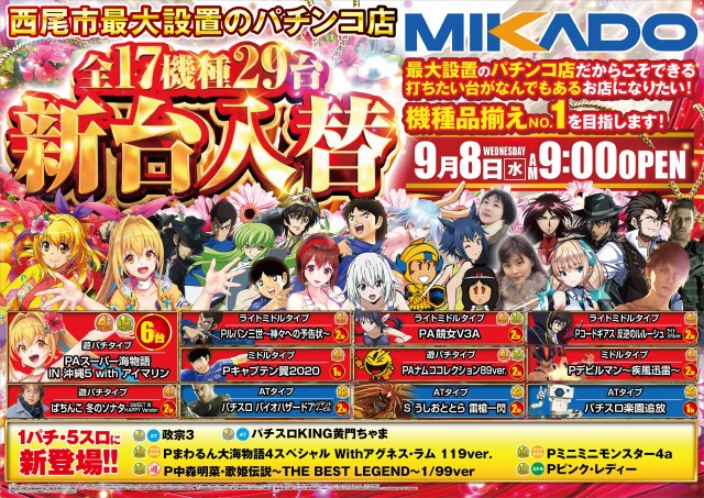 明日9月8日(水)新台入替!朝9時開店!17機種29台導入!