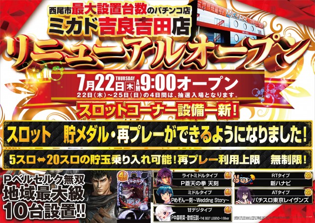 7月22日(木)リニューアルオープン!抽選入場 朝9時開店!