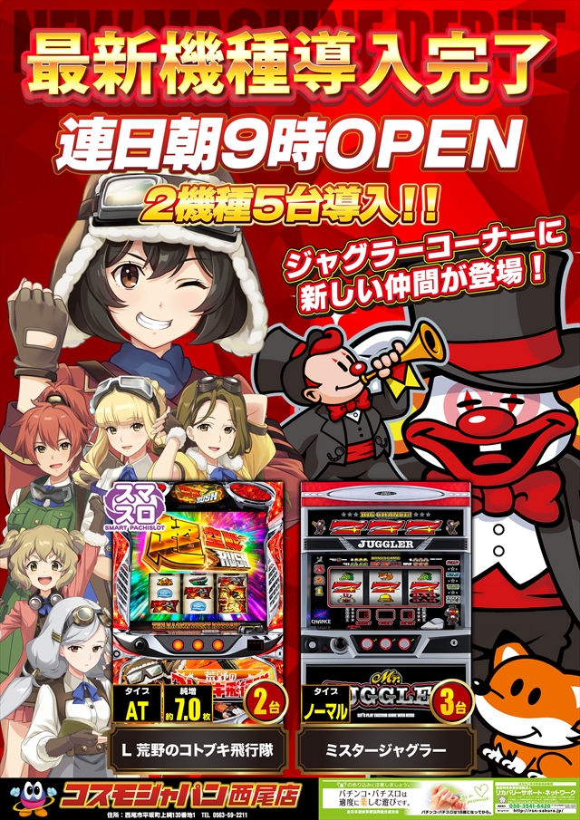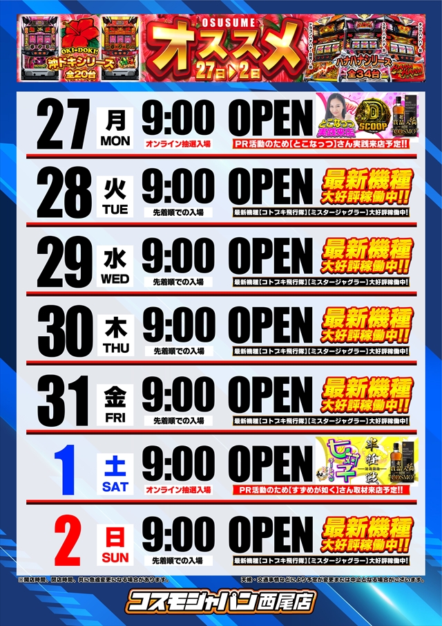 9:00~22:45(但し、新台お披露目日は夕方17時より開店予定) |