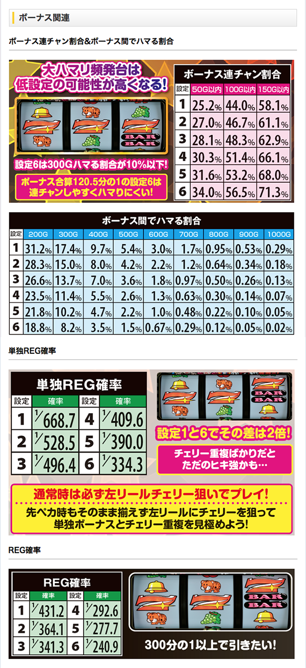 単独REG確率に大きな設定差が存在。ボーナスの当選契機を把握しておくことも重要なポイントだ。